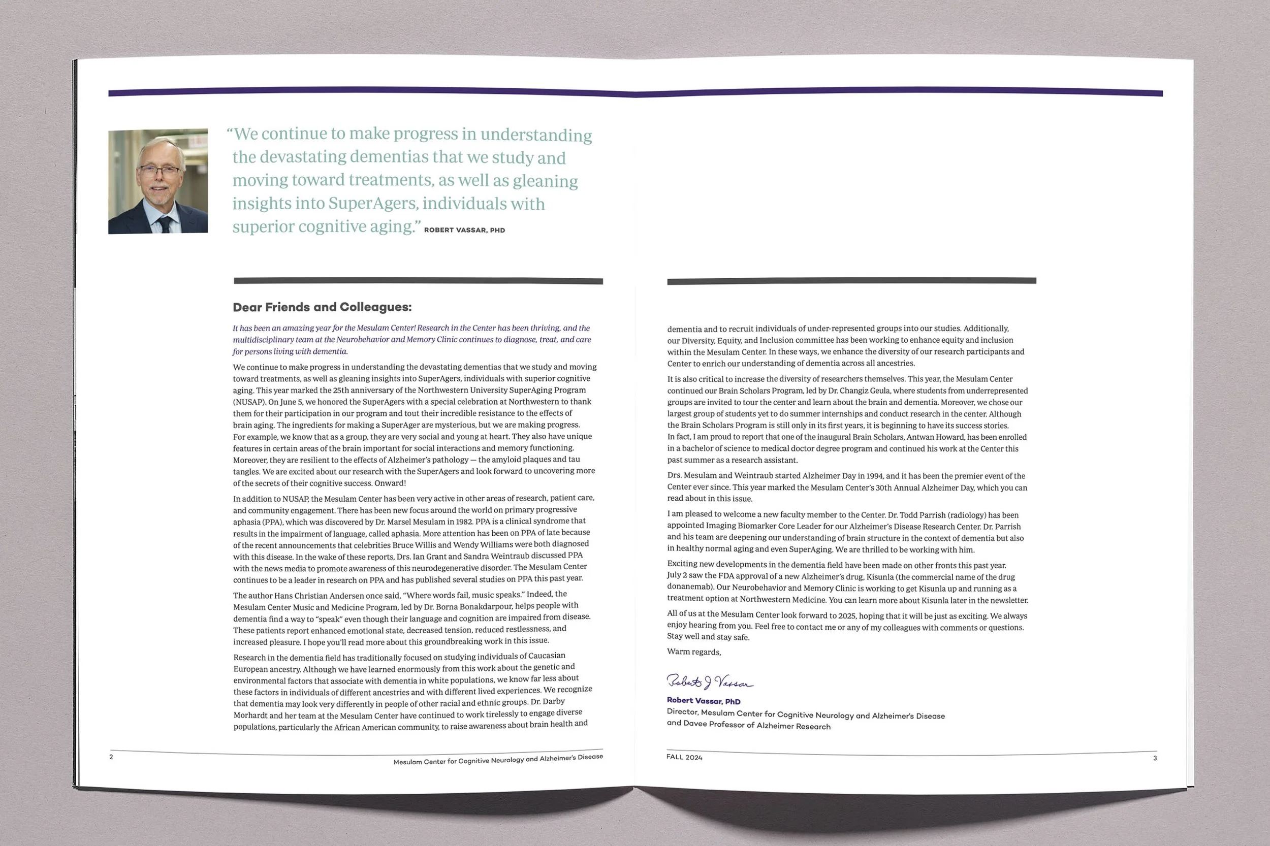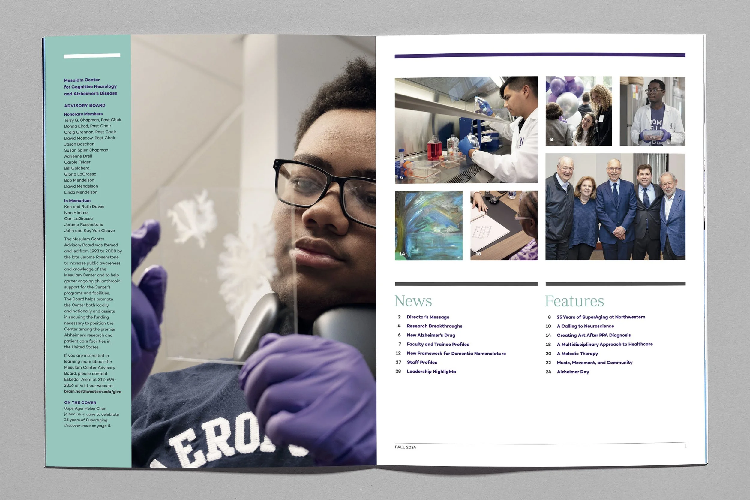 The Mesulam Center for Cognitive Neurology and Alzheimer’s Disease conducts research on the neurobiology of brain aging and dementias while providing critical care and support to its patients. This annual newsletter — sent to patients, caregivers, and donors — was redesigned to share the center’s latest research findings and stories of personal connections through engaging articles, images, sidebars, and informational graphics.